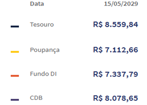 Para essa simulação, considerou-se o IPCA de 3,5% ao ano e o CDI de 8,75%, conforme projeções do Boletim Focus, do Banco Central. Nesse exemplo, a rentabilidade bruta de um CDB (certificado de depósito bancário) com retorno de 100% do CDI apresentou uma tendência menor de ganhos.