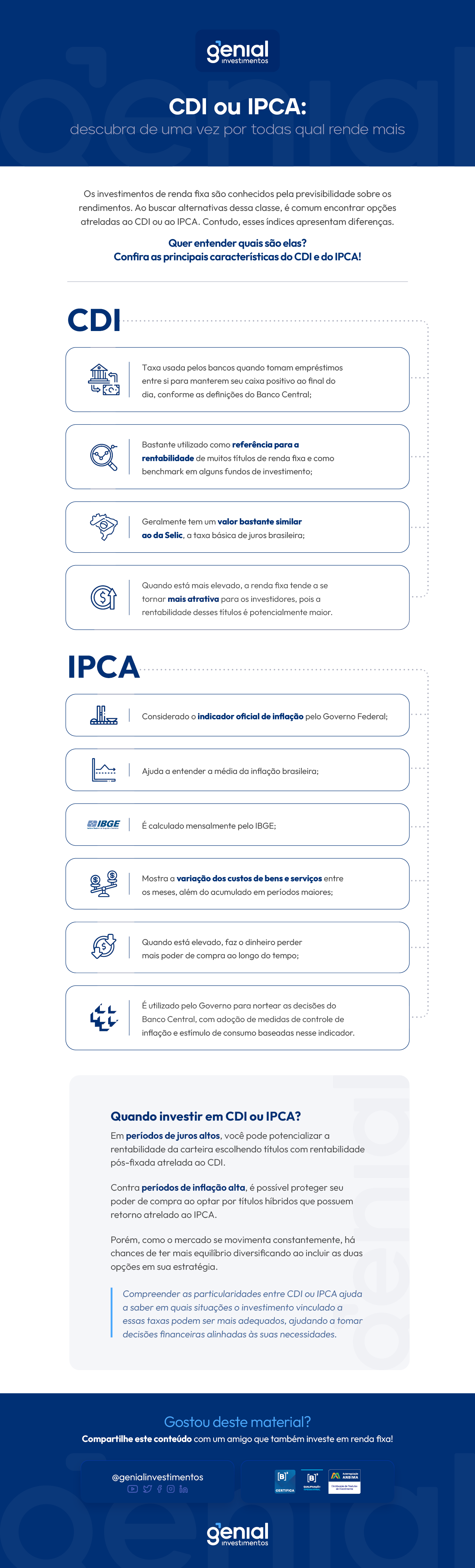 Entretanto, as projeções podem não se concretizar, já que existem diversos fatores que podem afetar a economia. Ademais, a decisão de investir em CDI ou IPCA também deve considerar horizontes maiores, a depender dos seus objetivos.