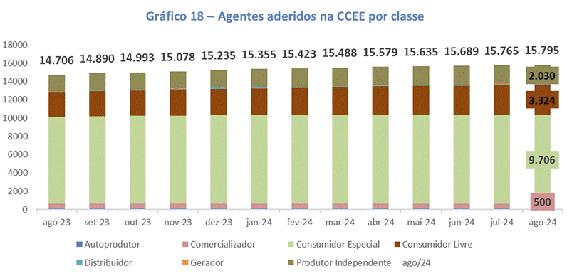 Segundo dados do órgão, em agosto de 2024, a quantidade de agentes participantes desse mercado chegou a 15.795. O número mostra um aumento de 7,4% em relação a agosto de 2023 e um crescimento da quantidade de consumidores livres e consumidores especiais no período — de 26% e 2%, respectivamente.